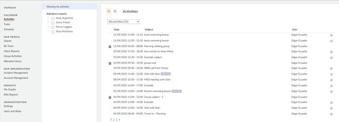 Your direct report activities will be displayed in different colours as you select them. Additionally, you can hover your mouse over the activity to see more activity information. Double-clicking the activity will open the client's activity.